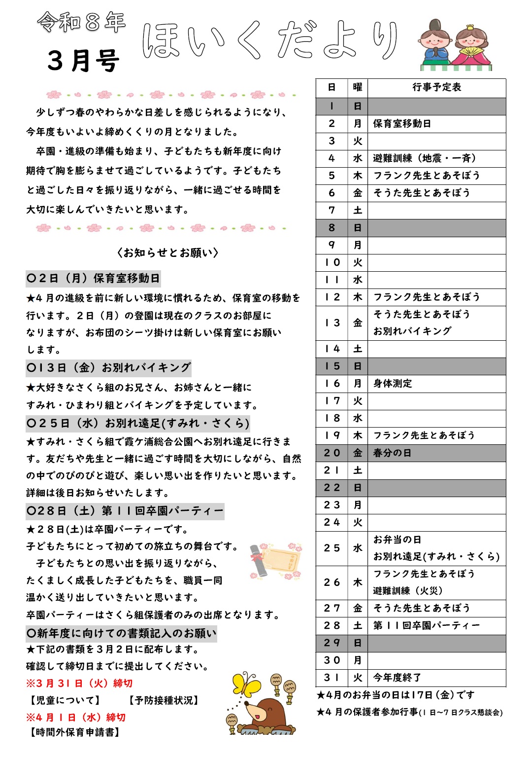 2026.03.30 / 最終更新日 : 2026.03.30 nijiirouser ほいくだより 令和8年3月号 献立表PDFダウンロードhttps://www.kouju.ed.jp/nijiiro/wp-content/uploads/2026/03/b3385b2b0762bb472a8626f23afd09ef.pdf